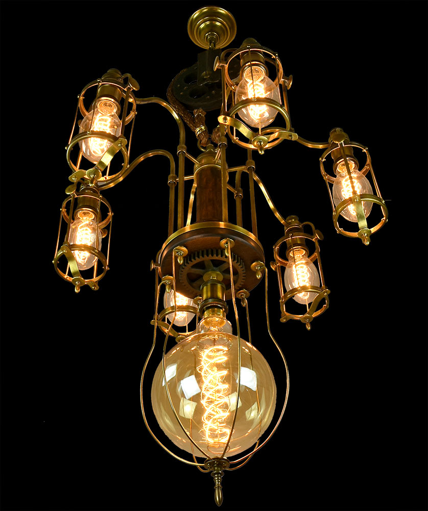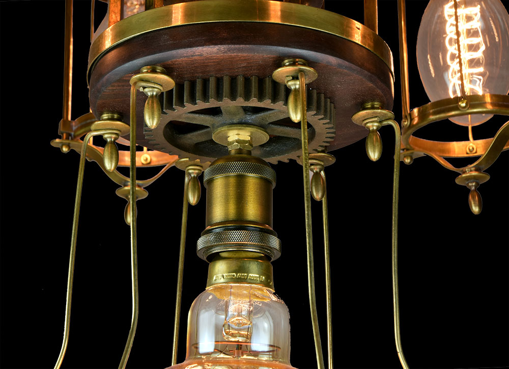 A brass monster with an equally monstrous name. Like most of my pieces, this one took on a life of its own and evolved along the way. Which I consider being one of the things that separate Art from furniture. The chandelier is primarily brass and cherry wood. The brass gear on the bottom is steel that has been hand plated in brass. As a piece like this takes a long time to create, one has plenty of time while working for the story to develop...