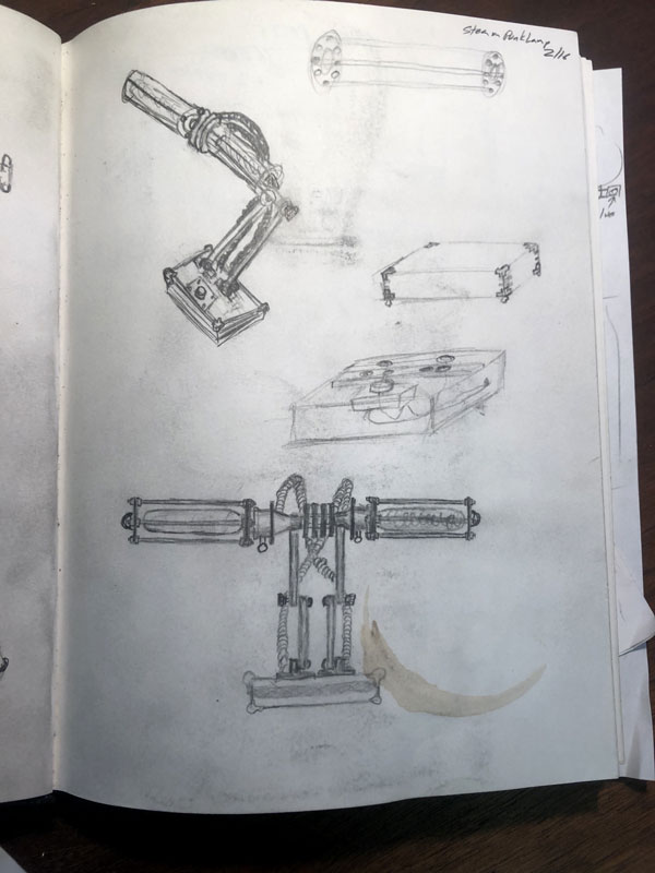 I had the idea for this piece thinking about what kind of writing lamp Mary Shelly used to write her legendary novel, Frankenstein. This is what I imagined. As you can see from the original sketches, this little monster took on a life of its own while being created. This lamp has a built-in dimmer. While it can be used for lighting, I prefer to barely turn it on with the dimmer.